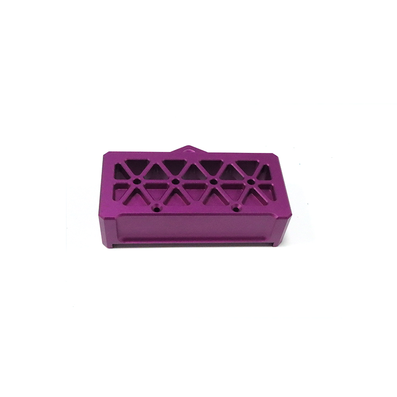 This CNC Milling part is made of 6061 aluminum material which has light weight, high strength and excellent cutting performance. It is a rectangular metal component with a deep purple color as a whole, a smooth surface and a delicate metallic shine. There is a triangular handle above, with triangular hollow patterns well arranged on both sides that form an orderly and aesthetically pleasing geometric texture.
