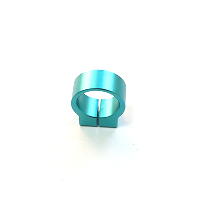 This bicycle seat buckle is made of aluminum alloy 6061 and has a circular structure overall. The surface was anodized to show a uniform and glossy blue-green metallic gloss; The outer ring is a smooth cylindrical surface, and there is a longitudinal section on the inside to form an elastic opening and closing structure of the closure, which facilitates the quick assembly and dismantling of the seat post. There are small projections in the lower part of the two ends to improve the stability of the fastening. The structure is compact, light and durable, aesthetic and functional, suitable for quick closing and adjusting various tube of the bicycle seat.